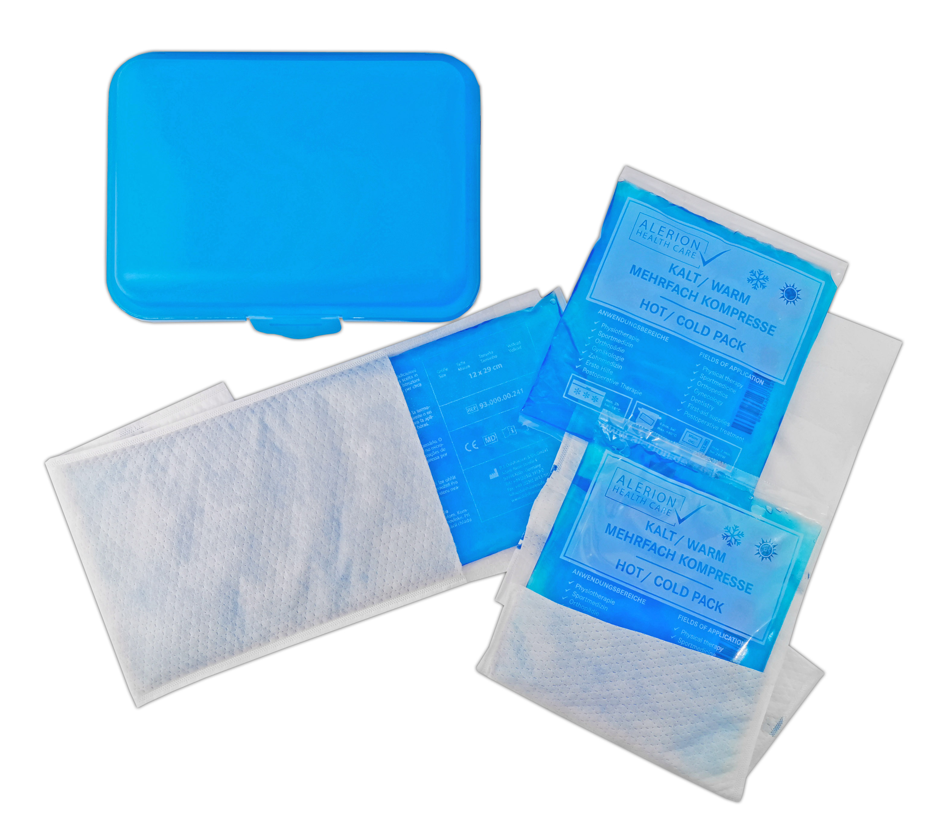 Durch die stabile Box ist eine hygienische Aufbewahrung der Kalt-Warm-Kompressen im Kühlschrank sowie ein unkomplizierter Transport zum Einsatzort möglich. gefertigt aus verstärkter Folie und umweltfreundlichem Thermogel